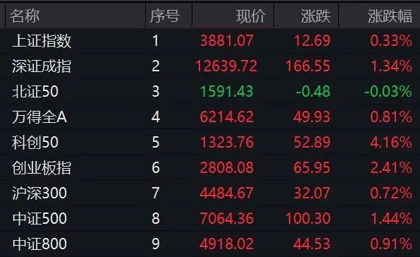 今日早盘,A股震动上扬,科创50指数放量大涨逾4%,再创3年半来新高,深证成指、创业板指等亦创多年来新高。下跌个股多于上涨个股,量能坚持平稳,1小时成交超万亿元。