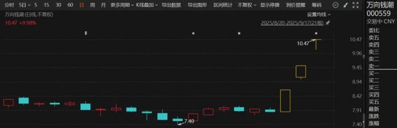 机器人概念股继续活泼,万向钱潮(000559)连续第三天涨停,此外景兴纸业、露笑科技均涨停,宏昌科技、汉威科技、东山精密、首开股份跟涨。
