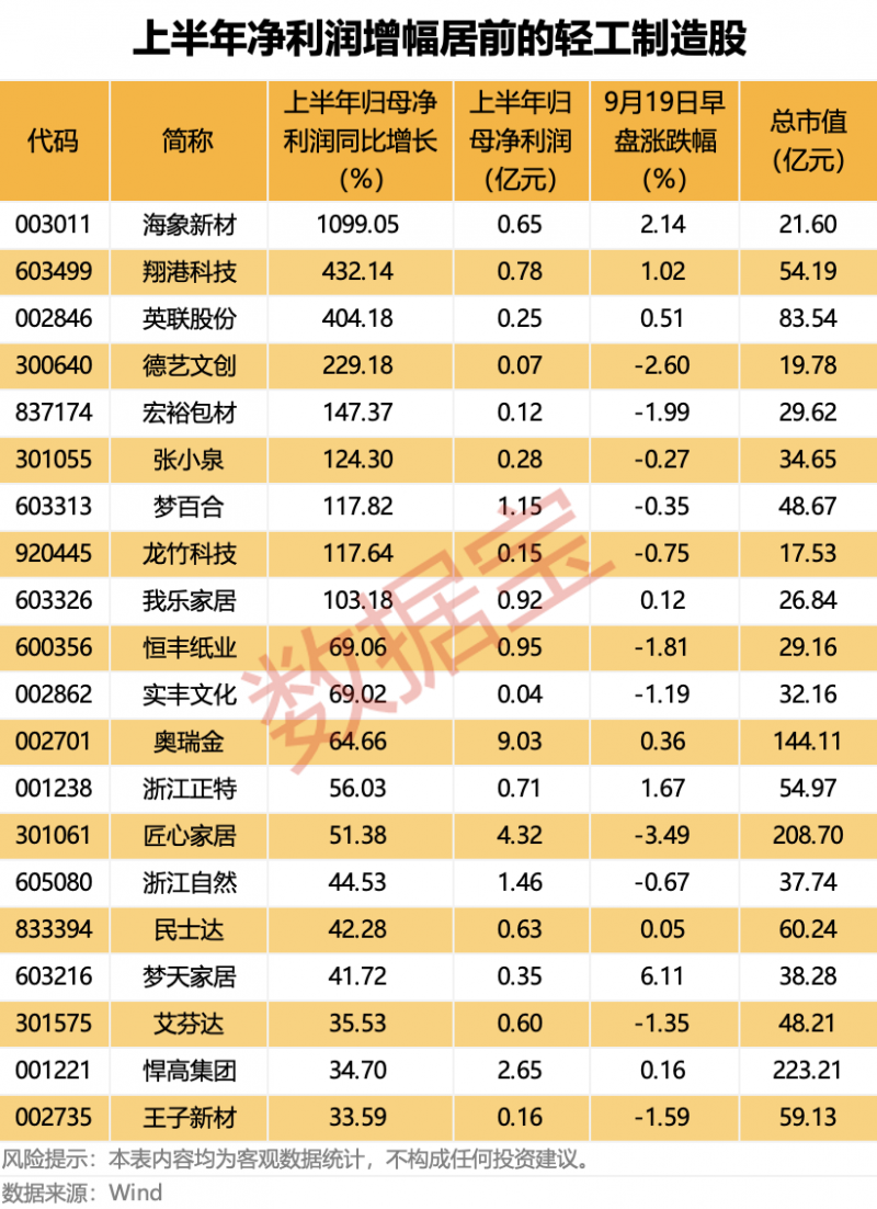 A股轻工制造板块共有166股,从成绩上来看,上半年59股归母净赢利完成同比增加,6股扭亏为盈,10股减亏,报喜比例约为45%。在归母净赢利完成同比增加的个股中,海象新材、翔港科技、英联股份增幅居前,均超越400%。
