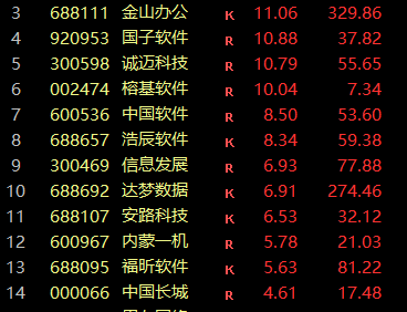 盘初,国产软件板块继续发力,我国软件一度涨停,金山办公一度涨超15%,达梦数据、我国长城、太极股份等全线上扬。