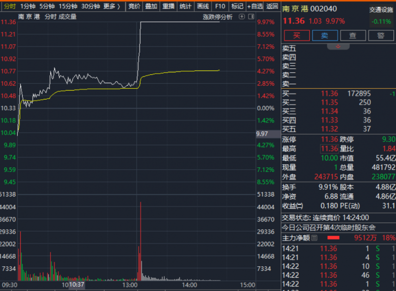 10月13日午后,南京港股价直线拉升,3分钟内就被资金封死涨停板;连云港也大幅拉升,涨幅一度接近8%,北部湾港、重庆港也纷繁跟涨;部分航运股也有拉升动作,国航远洋、宁波海运一度涨超6%,凤凰航运、华光源海等跟涨。