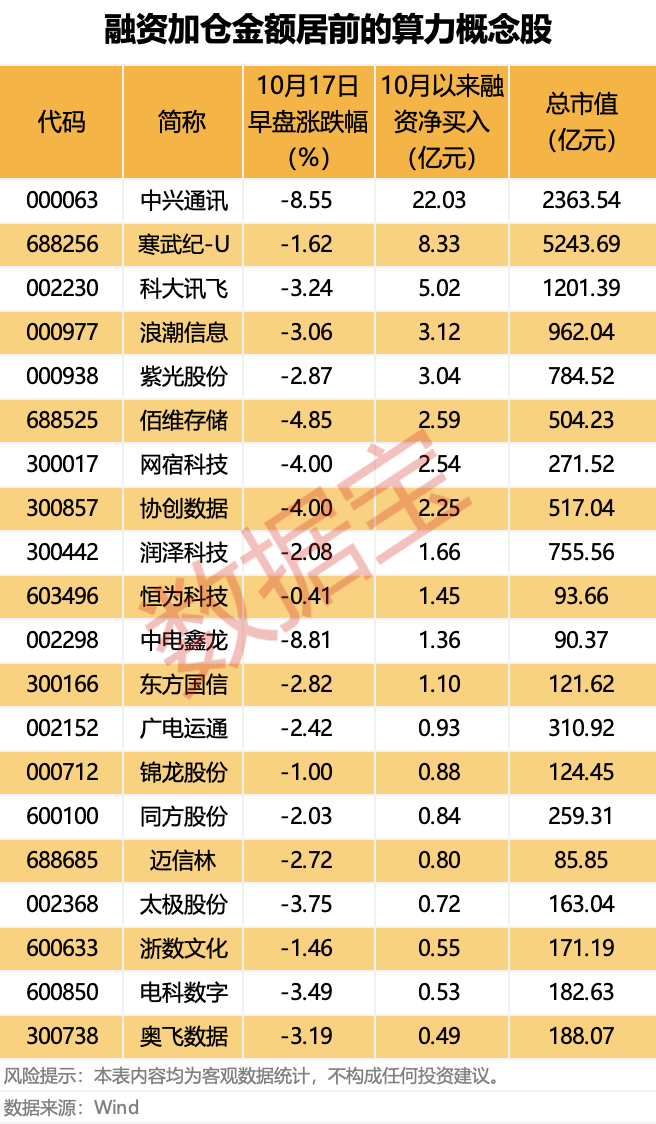 从资金面上来看,近期杠杆资金显著加仓算力板块,10月以来概念股合计获融资净买入27.66亿元,中兴通讯、寒武纪-U、科大讯飞净买入金额居前,分别为22.03亿元、8.33亿元、5.02亿元。