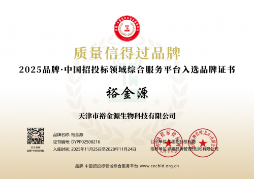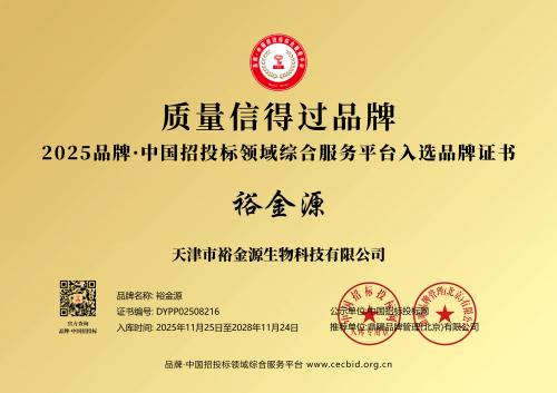 近日,天津市裕金源生物科技有限公司凭借其卓越的产品质量和良好的市场信誉,成功荣获由品牌·中国招投标领域综合服务平台颁发的“质量信得过品牌”证书。这一荣誉不仅是对裕金源品牌实力的高度认可,也是对其在生物科技领域持续创新和追求卓越的充分肯定。